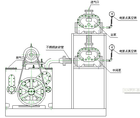 JZJH系列羅茨滑閥真空機組是由普通羅茨泵為主泵、滑閥真空泵為前級泵串聯組成的真空機組。通過真空繼電器或電接點壓力表,來實現羅茨泵滑閥泵的自動啟閉,自動過載保護。JZJH型羅茨滑閥泵真空機組安裝在一個機架上,配以管道、閥門、電器操作控制箱、冷卻水管系統。機組結構緊湊,使用方便。